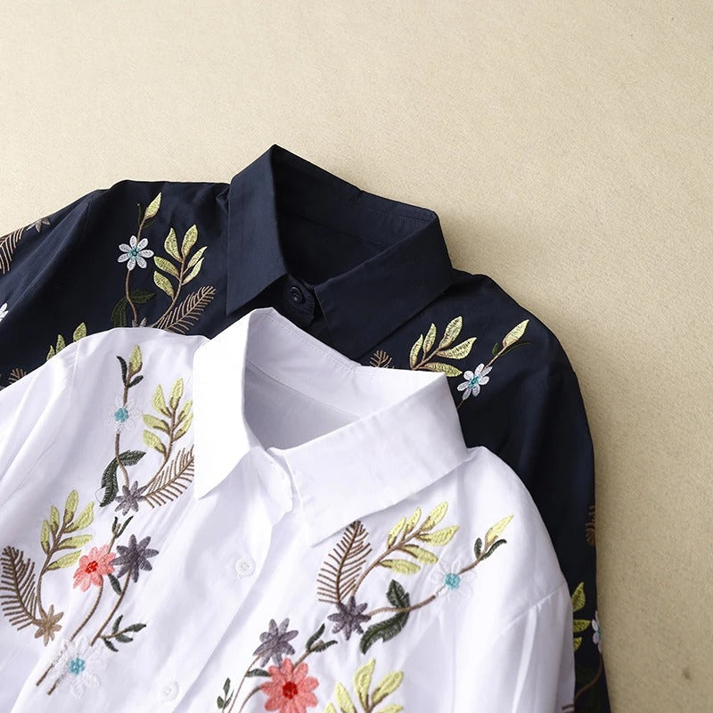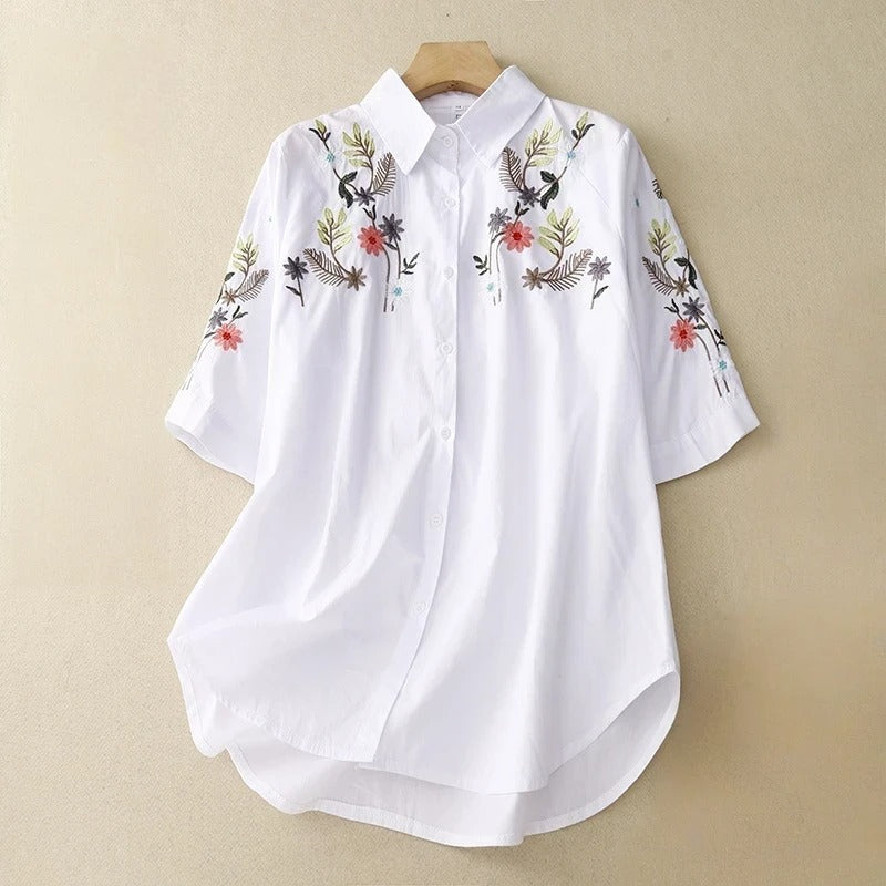 Soft linen and sun-washed blooms entwine in this blouse designed for dreamers. With its relaxed drape and intricate embroidery, it brings an air of bohemian ease — ready for market wanderings and open-air cafés.